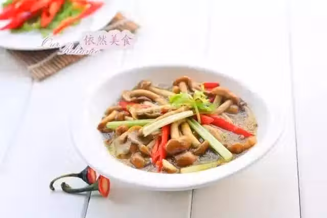 滑菇350克,紅辣椒2個,芹菜2棵,生薑、植物油、鹽、昆布調味粉適量