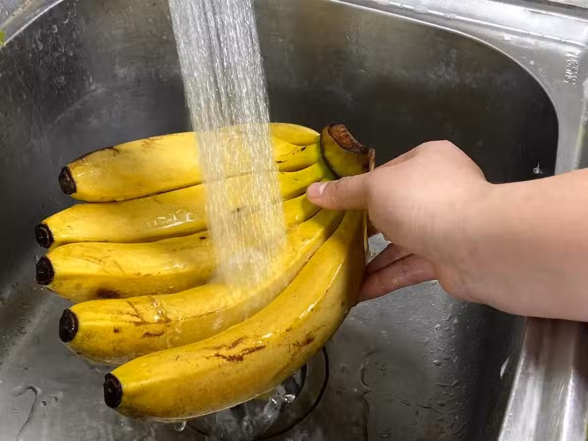 2、所以我們在保存香蕉之前需要進行一個步驟,那麼就是把香蕉清洗一遍,我們在大盆中加入少許的食用鹽,還有小蘇打,然後把香蕉放到蘇打鹽水裡面。浸泡五分鐘時間把香蕉表面上的一些保鮮劑,還有農藥的殘留給他清洗乾淨。沖洗好之後再用流動的清水給它沖一遍。
