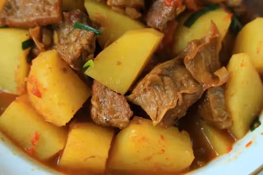 從外觀上看,牛腩燉土豆更是一道視覺與嗅覺的雙重享受。紅亮的番茄湯汁包裹著金黃的土豆塊與深棕色的牛腩,色彩鮮艷,誘人食慾。熱氣騰騰中,香氣四溢,牛肉的醇香、番茄的酸甜與土豆的香氣交織在一起,形成了一股難以抗拒的誘惑力,讓人一眼望去便心生嚮往。