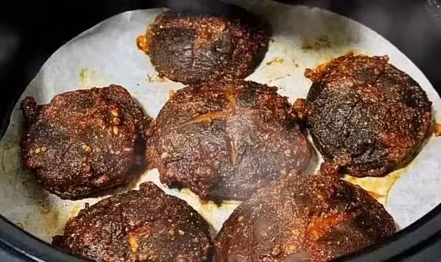 3、空氣炸鍋鋪好油紙,香菇擺放在油紙上,刷一層醬料,空氣炸鍋180度10分鐘