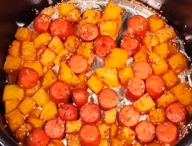 1、土豆洗凈去皮切丁,火腿腸切丁,土豆焯水2-3分鐘,放一勺生抽,一勺油拌勻,放入空氣炸鍋,溫度170度9分鐘。