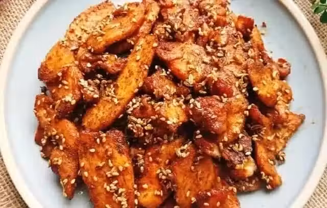 3、時間到,放入辣椒麵,白芝麻,孜然粉拌勻,噴一點油,再烤6分鐘即可。