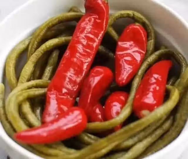 2、將四季豆擇去老筋洗凈,晾乾表面水分,把之前調好的泡菜水倒入壇中,再放入豆角,用竹片把菜夾緊,壓上石頭。