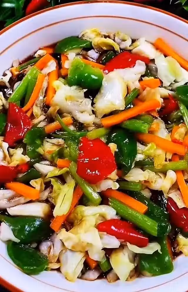 2、把捲心菜切成絲,把胡蘿蔔切絲,芹菜切成段,尖椒去蒂切成絲。
