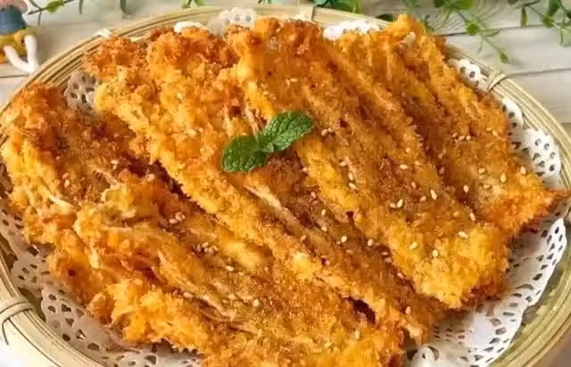 3、熱鍋放油至六成熱,放入金針菇炸至金黃,撈出控油,撒上椒鹽粉即可。
