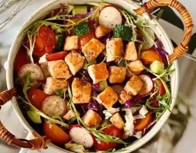 5、在沙拉盤中底部鋪上葉菜,在放上黃瓜丁、聖女果和櫻桃蘿蔔,再放上煎好的三文魚塊,淋上調好的油醋汁攪拌均勻就可以食用了。