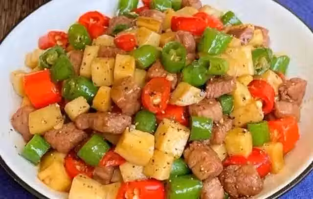 3、放入牛肉丁、辣椒翻炒斷生,加一勺生抽+一勺耗油+少許鹽+黑胡椒+雞精調味,翻炒均勻即可。