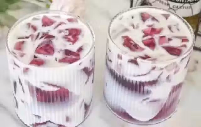 3、加入玉米糖漿+白涼粉拌勻後繼續煮沸,倒入杯中晾涼凝固,放入冰箱冷藏。