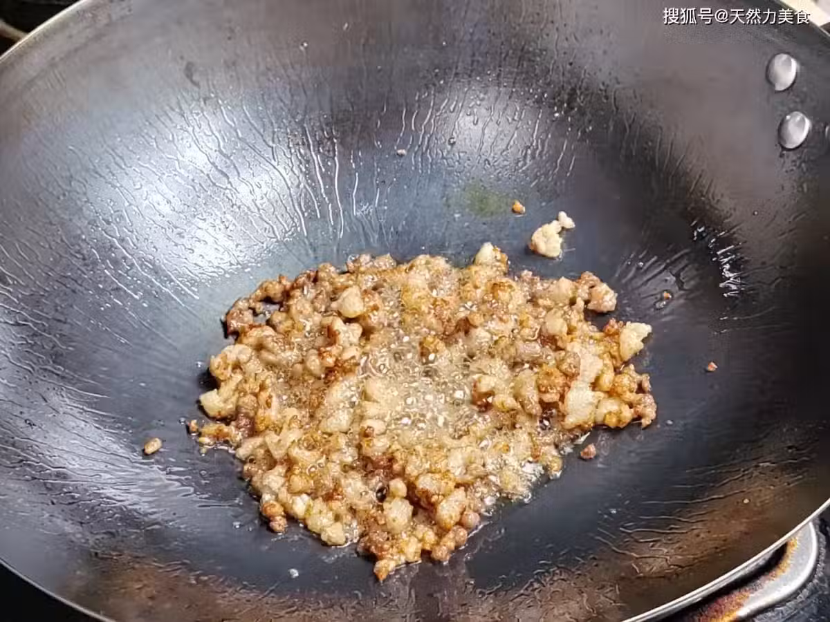 6、把準備好的熗鍋增香的料頭(蒜末、薑末、小米椒)一起倒進鍋內,翻炒10秒左右,香味就能激發出來。注意,這些料頭體積比較小,香味比較容易出來,不需要炒太久,否則容易燒焦變黑。