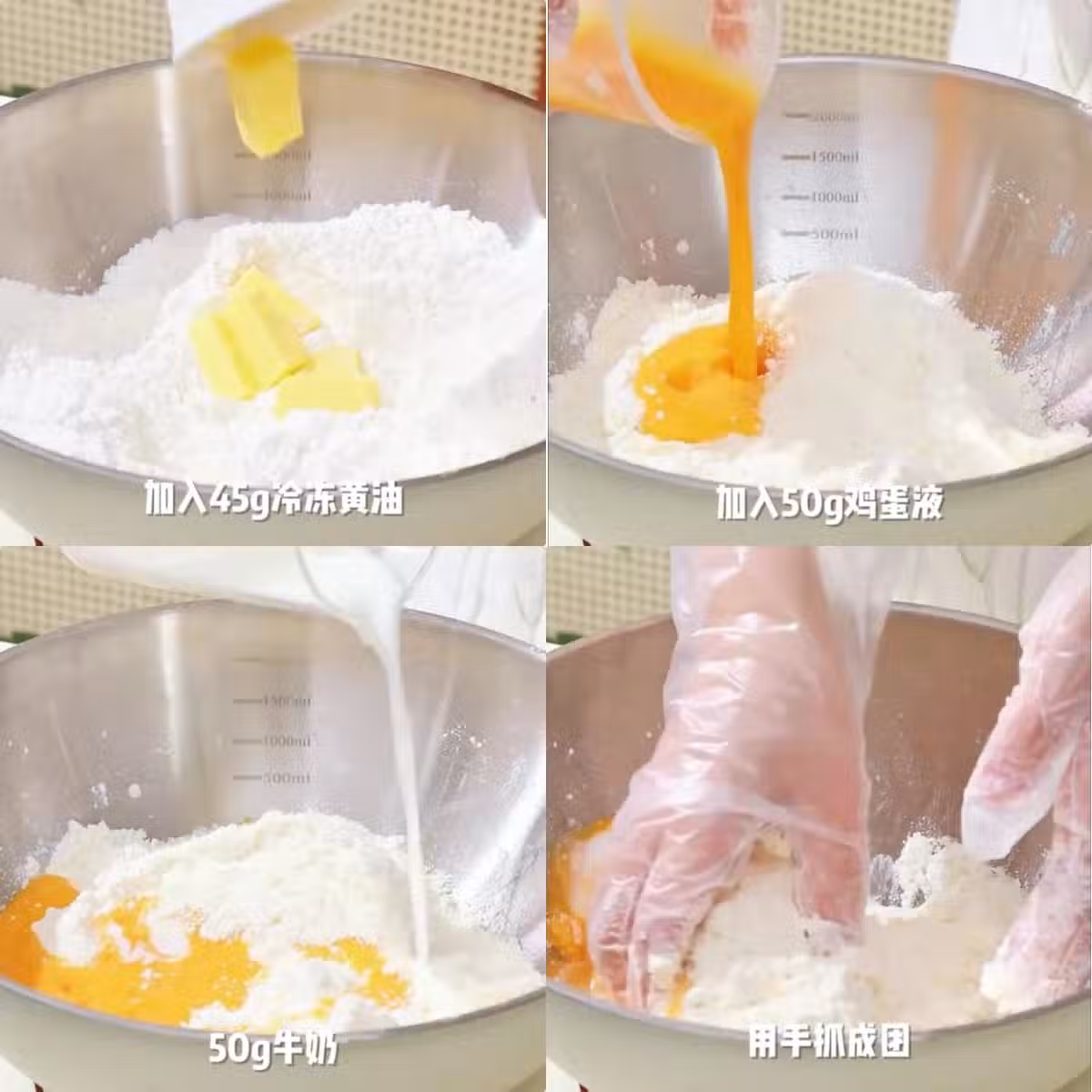 2️⃣ 加入45克冷凍黃油,用手搓成細沙粒狀,加入50克冷藏雞蛋液、50克冷藏牛奶,用手抓成團,不要過度揉,以防起筋。