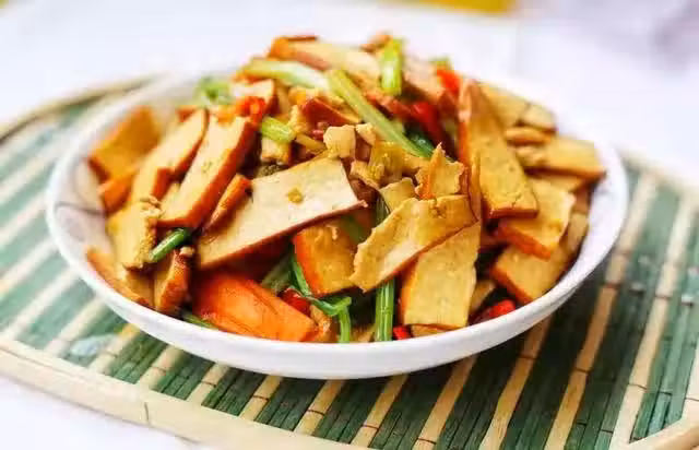 5、接著倒入切好的香乾翻炒片刻