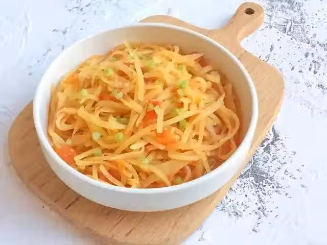2、將土豆絲反覆清洗掉澱粉,浸泡半小時,然後瀝干水備用