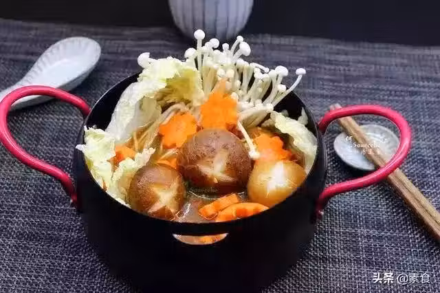 大白菜200克,胡蘿蔔200克,金針菇200克,香菇4朵,花生油2ml,麻油2ml,干辣椒10克,小辣椒3個,八角1個,花椒1克,香葉1片,素高湯適量