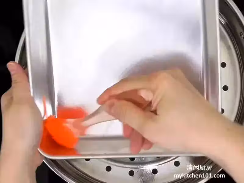 2 把蒸爐的水滾開,然後放入烤盤。將1份白色粉漿再次攪拌均勻後倒入,以大火蒸3分鐘半。