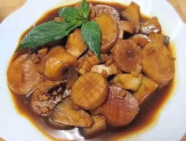 4、倒入醬油約1匙的量,再加入一小匙的糖(也可依照杏鮑菇的量以及個人口味調整),加入一點水蓋上鍋子悶燒約兩分鐘後掀蓋收汁即可起鍋盛盤,醬燒杏鮑菇醬汁淋在白飯上很下飯,是道開胃爽口的美味素食。