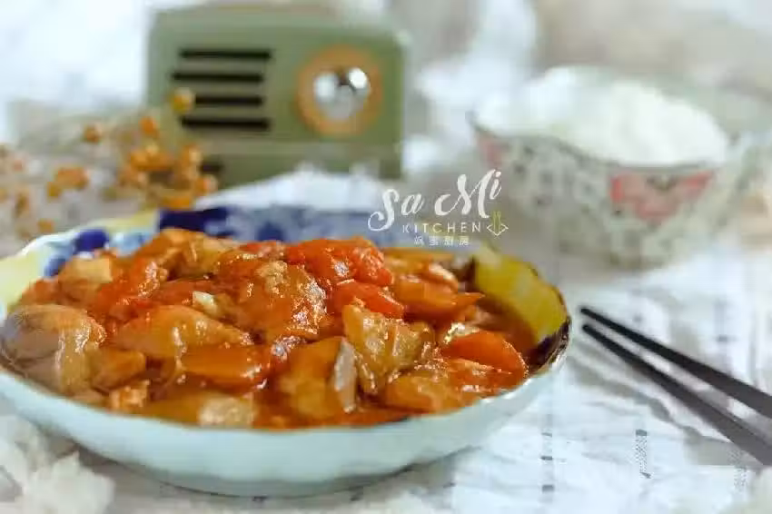 7、直至西紅柿的湯包裹住茄子,放入薑末,淋入水澱粉勾芡即可出鍋