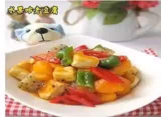木瓜,火龍果 適量,紅椒 1個,老豆腐 1塊,番茄醬 2大勺,鹽 1小勺,糖 1大勺,醋 1小勺,水澱粉 2大勺