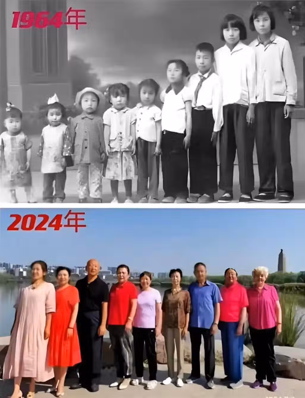 九個兄弟姐妹,六十年一個不少 在這張合影里,九位兄弟姐妹 穿著樸素,與60年前的照片形成了鮮明的對比。