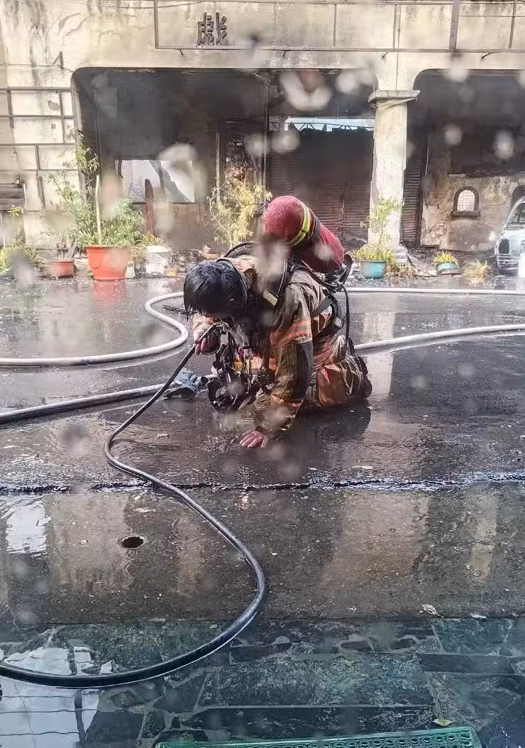 其中一名消防員在火場中衝出,用水管降溫後,又毫不猶豫地再次返回火場繼續救援。