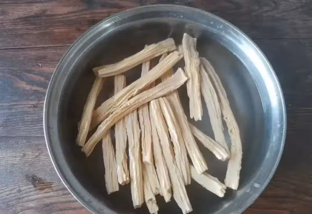 腐竹非常的輕,放上水之後腐竹都會漂在水上面,腐竹放入盆中泡的時候,為了防止腐竹飄起來,可以在腐竹上面壓個盤子,這樣腐竹會全部沒入水中,這樣腐竹就會泡發的均勻,軟硬一致,腐竹放在水中浸泡完畢之後,判斷是否泡好的依據,用手捏一下腐竹看看有沒有硬心,如果有就證明浸泡的不充分,需要放入溫水中繼續浸泡。