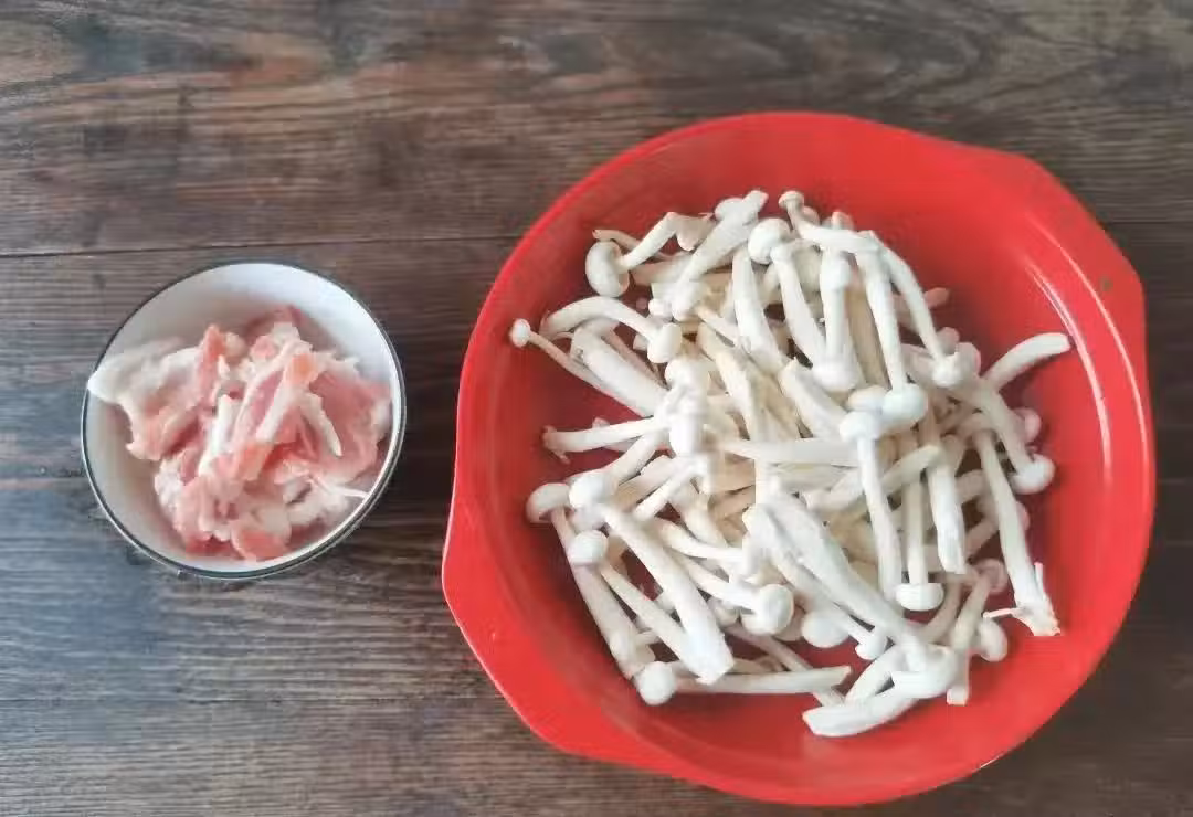 2.把白玉菇切去根部,分成小朵,五花肉切成片
