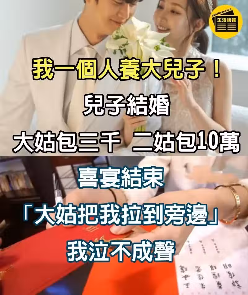 老公出事後我一人帶大2個兒子,兒子結婚時「二姑姐包10萬、大姑卻只包3千」! 喜宴結束「大姑特意拉我到一旁」我泣不成聲:原來她用心良苦