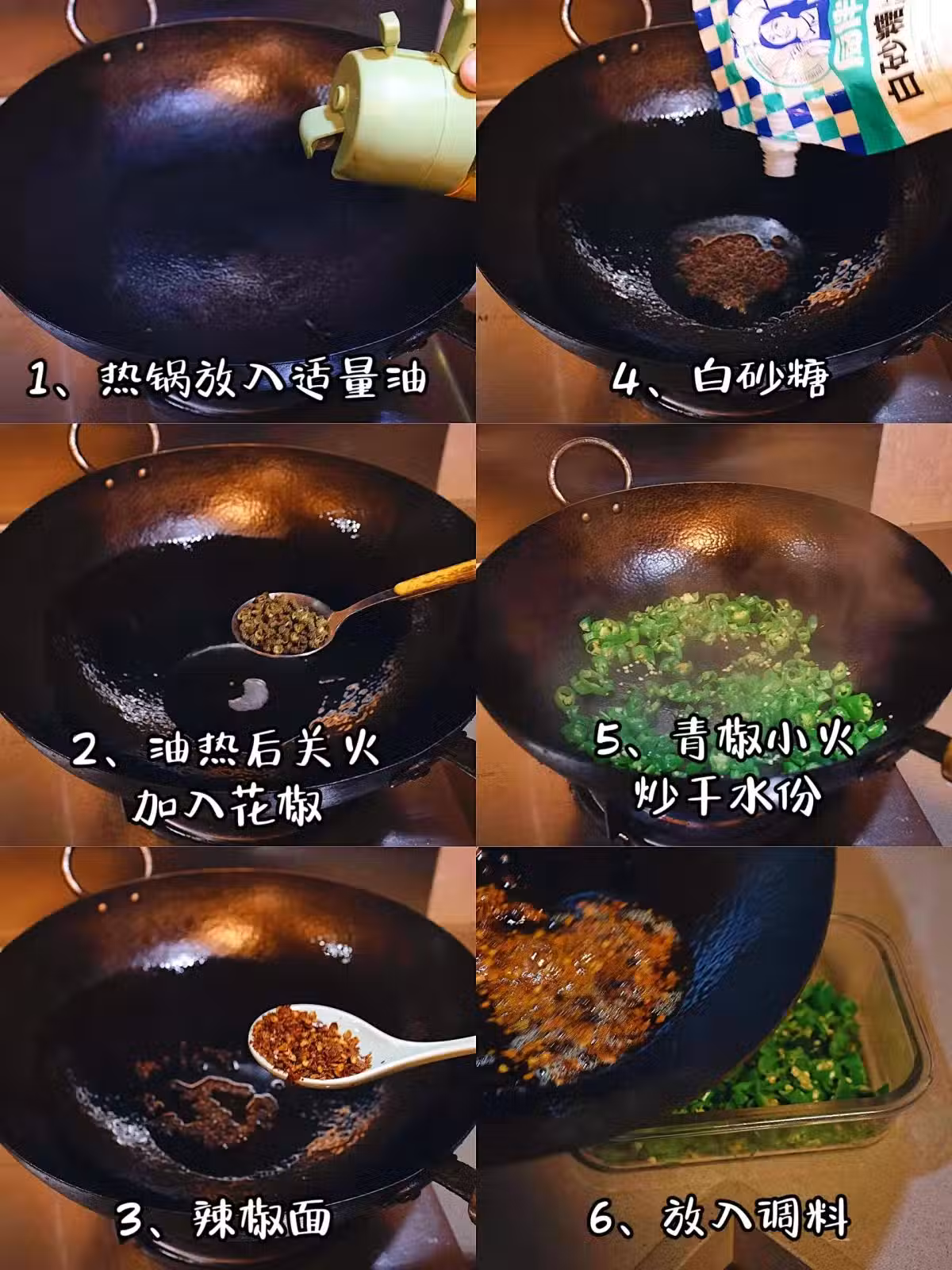2、加入新鮮辣椒:事先將青椒炒干水分,這樣既能保留其爽脆口感,又能讓醬料更加乾爽。接著,將炒乾的青椒加入之前炒制的調料中,繼續攪拌均勻。