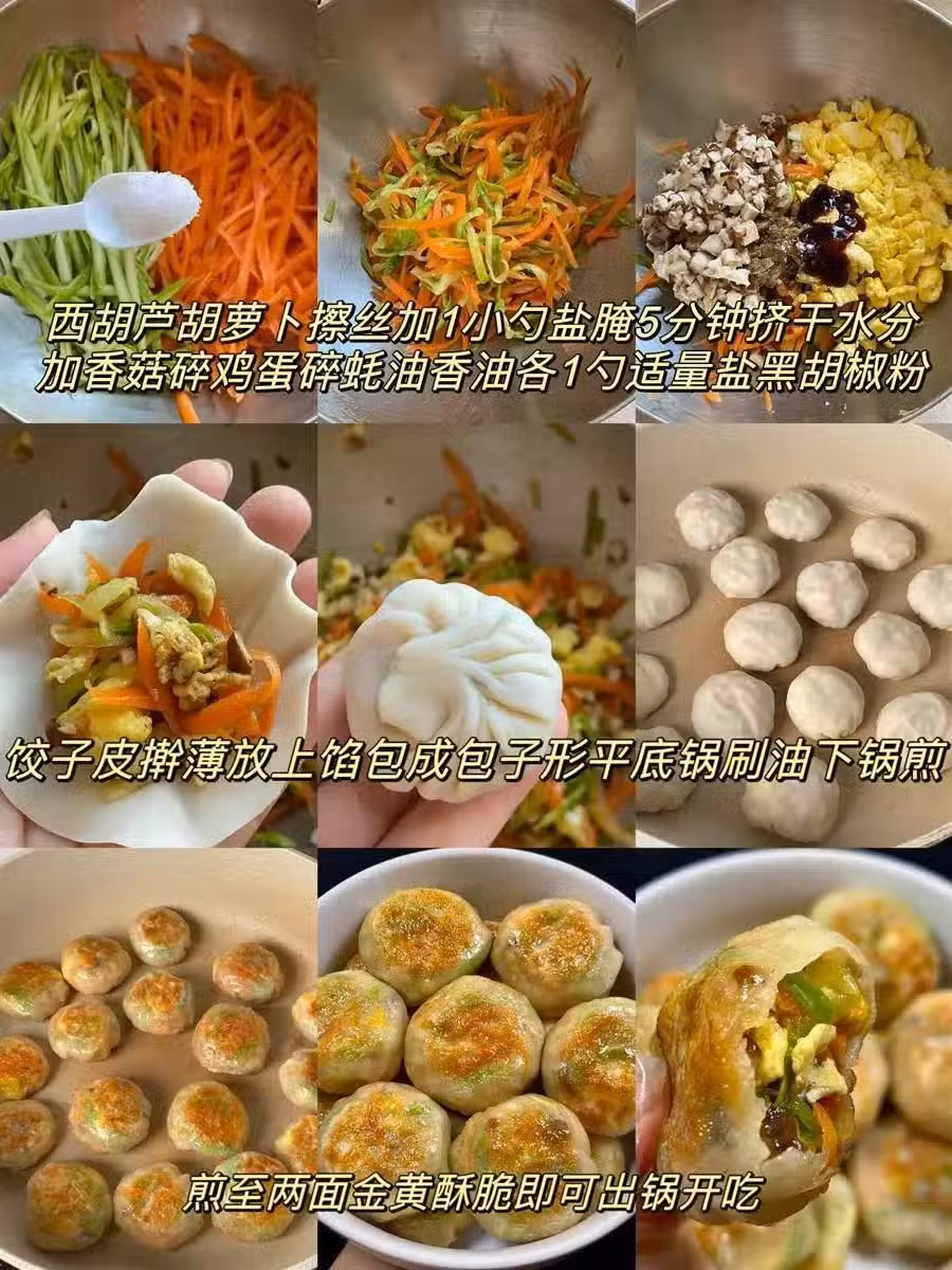 煎餡餅:平底鍋刷油加熱,將包好的餡餅底部朝下,放入鍋中煎至兩面金黃,餡餅表皮酥脆即可。