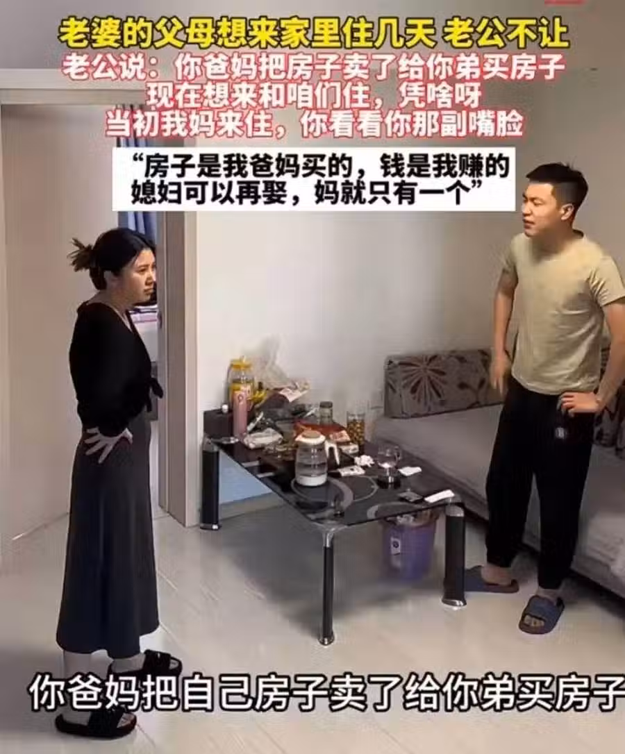 影片中,老婆地父母想過來住幾天,可是卻遭到了丈夫地強烈反對。女子怒喊丈夫:「自己父母過來住,為啥不行?」丈夫也情緒激動地回應:「你爸媽把房子賣了,給你弟弟買的房,現在卻要過來和我們住,憑什麼啊!」