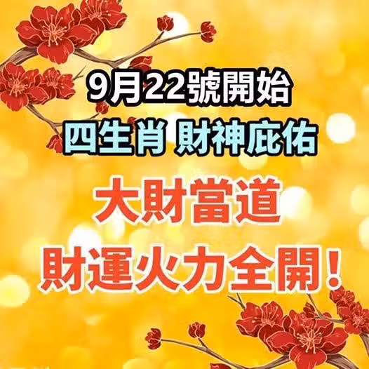 9月22號開始, 四生肖財神庇佑,大財當道,財運火力全開!