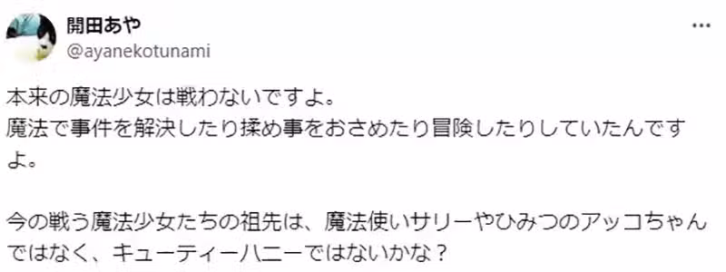 「真的。如果仔細分析所謂『小魔女』、『變身少女』、『女英雄』這類元素的話,就會發現似乎沒有作品能夠完全符合每一個人對於『魔法少女』的期待,即便從反王道的作品反推,也沒什麼作品符合所謂『標準的魔法少女』。」