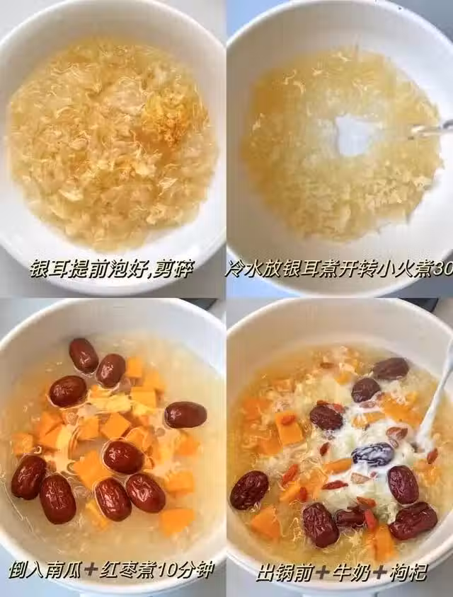 牛奶南瓜燉銀耳,這一碗頂10張面膜~初秋季節天氣乾燥,除了外養,內調也相當重要!這一碗全是養氣血食材!滿滿的膠原蛋白!