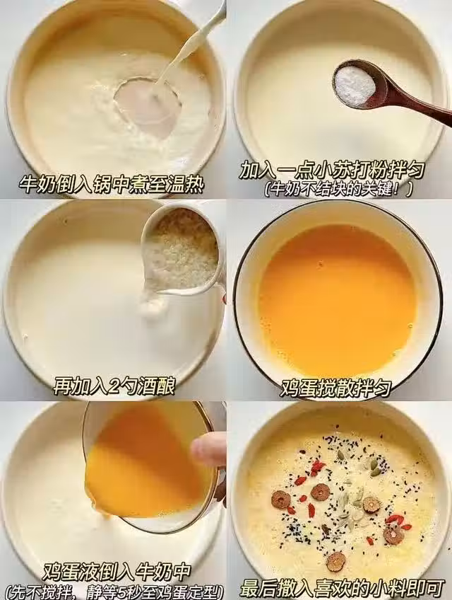 牛奶雞蛋醪糟,女孩子一定要學會這道養生小甜湯!之前在親戚家喝過一次,喝完一直念念不忘,嫩滑的雞蛋、濃郁的奶香~還有一股香氣撲鼻的酒釀,好喝到停不下來!喝完整個人暖乎乎的,巨舒服!