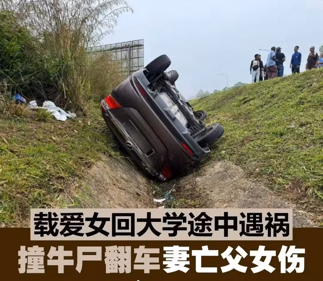 載愛女回大學途中遇禍 撞牛屍翻車妻亡父女傷