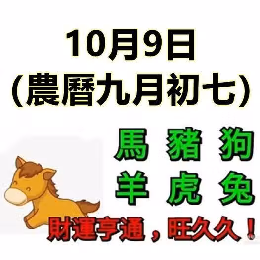 小運播報:2024年10月9日,星期三,農曆九月初七,法定工作日。