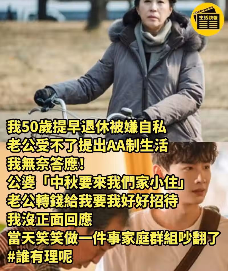 我50歲提早退休被嫌自私「老公受不了提出AA制生活」我無奈地答應! 公婆「中秋要來我們家小住」老公轉錢給我要我好好招待,我沒正面回應「當天笑笑做一件事」家庭群組吵翻了 #誰有理呢