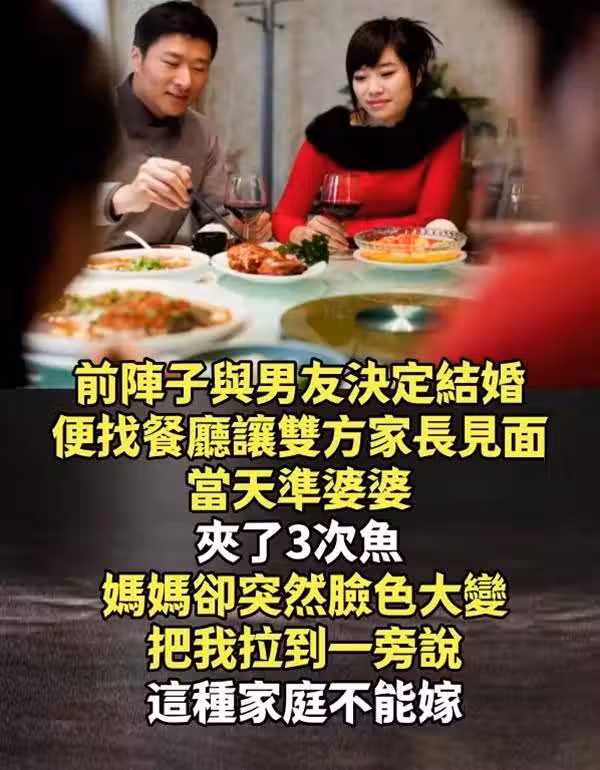 前陣子與男友決定結婚,便找餐廳讓雙方家長見面。當天准婆婆「夾了3次魚」,媽媽卻突然臉色大變,把我拉到一旁說:「這種家庭不能嫁!」