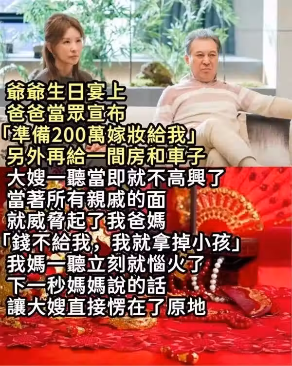 爺爺的生日宴上,爸爸當眾宣布「準備200萬嫁妝給我」另外再給一間房和車子,大嫂一聽當即就不高興了,當著所有親戚的面就威脅起了我爸媽,「錢不給我,我就拿掉小孩」 我媽一聽立刻就惱火了,下一秒媽媽說的話讓大嫂直接愣在了原地
