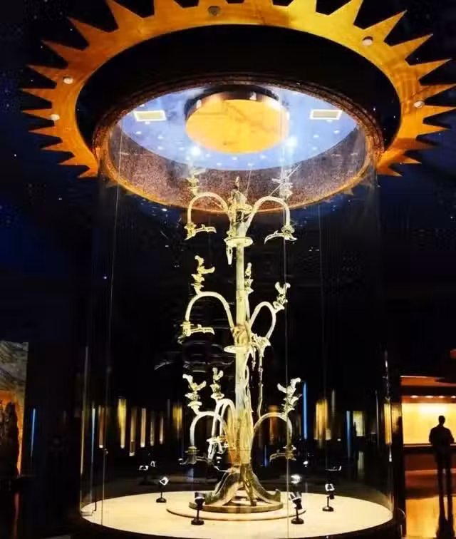 它共分為三層,每一層上面都有三隻太陽神鳥,看它的外形像極了傳說中的扶桑神樹,其複雜的工藝和造型更是花費了工作人員十年時間才修復完成。還有這座青銅立人銅像,它通高2.6米,頭上戴著一頂太陽花冠,可是讓人奇怪的是,他雙手擺出了環抱的動作,就像是在指揮著什麼一樣,但是專家到現在都無法解釋這個動作的意義。