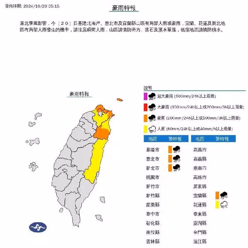 根據氣象署的最新預報,受到東北季風的影響,今天基隆北海岸、台北市以及宜蘭縣山區會有局部大雨或豪雨。