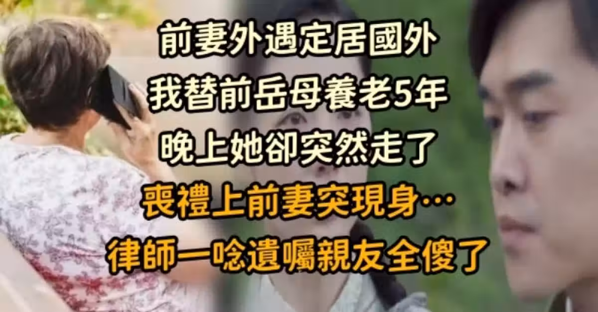 前妻外遇定居在國外,我替前岳母養老5年,晚上她卻突然走了,喪禮上前妻突現身…律師一念遺囑親友全都傻了