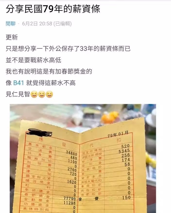 翻出阿公「34年前薪資單」,網見全勤獎金額哀號:別說了