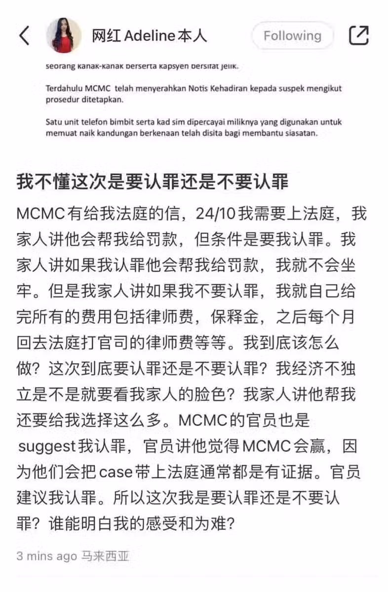 她指稱,根據MCMC官員的說法,被控上庭的案件一般上是證據確鑿,因此也勸她認罪。