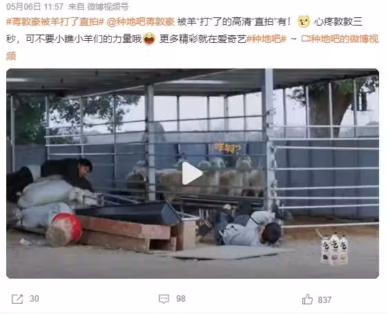 因為《種地吧》,他上了人生中第一次的榜一熱搜:#蔣敦豪被羊打了#。