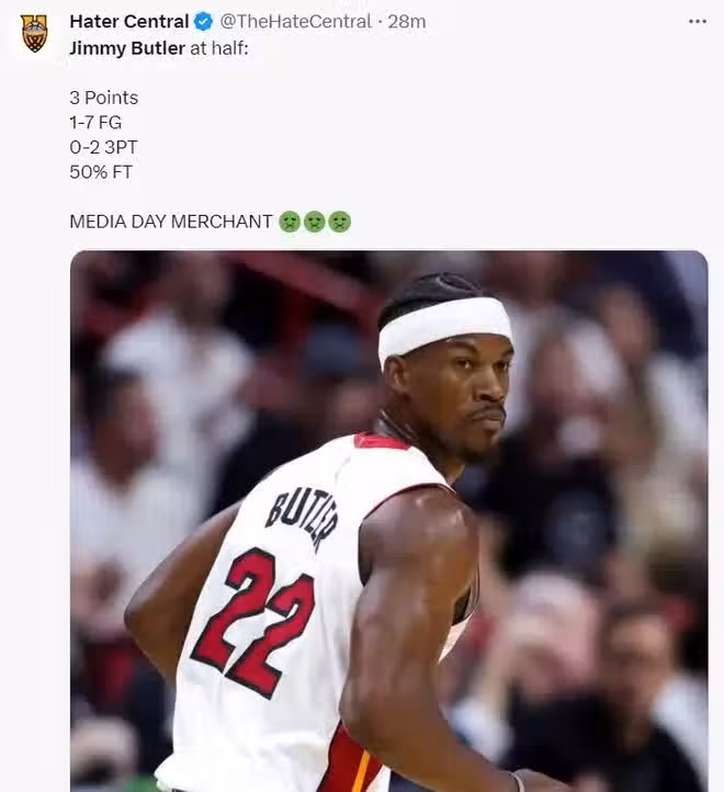 上半場打完巴特勒15分鐘,7中1,三分2中0,拿3分,罰球命中率50%,這就是揭幕戰的巴特勒,他不想在邁阿密繼續打球的想法已經用行動證明了。