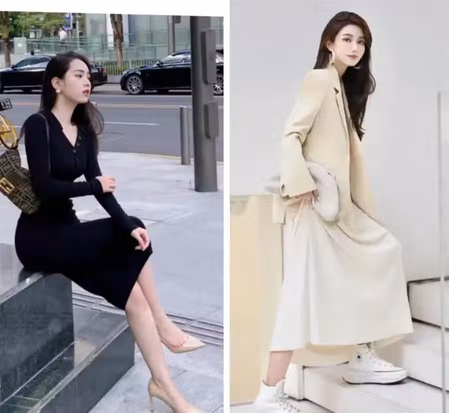 再搭配非常優雅感的裙裝的時候,在搭配高跟鞋的效果就是雙重優雅高級感的襯托力,還能夠完美的提襯身形的優勢所在,而如果是搭配的帆布鞋就很明顯的看出來了休閒、隨性的感覺,視覺感和修飾力的區別都很大。