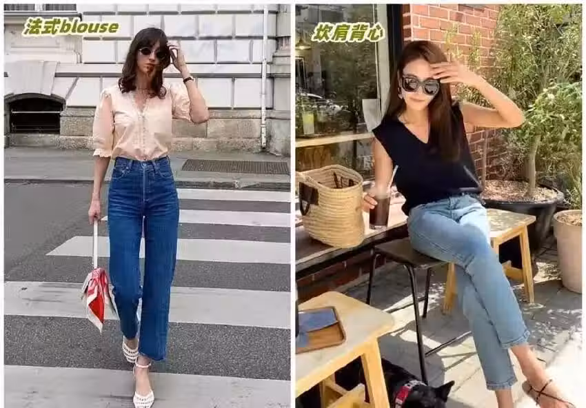 牛仔褲想要打造高級感,可以往幹練和貴氣的單品中來選擇,法式blouse和坎肩背心都屬於帶有女人味但版型有很乾練的單品,搭配直筒牛仔褲既吸睛又簡約。