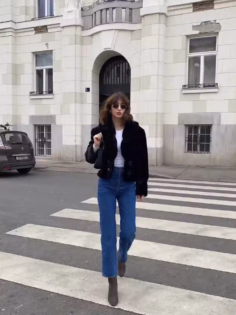 無痕靴還有一個經典的法式穿搭組合:條紋衫+九分直筒牛仔褲+無痕靴。