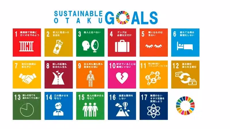 2015年的時候,聯合國提出了17項所謂的「永續發展目標」,好比消除貧窮、消除飢餓、消除不平等之類的。而這些大項又分成上百個細項,希望作為2030年以前在各國推廣的政策路線,讓地球能夠永續發展。最近有位日本網友就以此作為靈感,提出了17項「宅宅永續發展目標」。據說只要遵守這17項目標,就能夠讓宅宅永續「宅」下去。