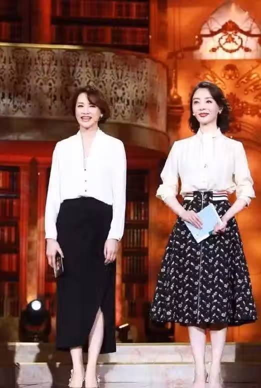 董卿的這件黑色半身裙,已經算是中高腰了,但是與陳數同框時,陳數的高腰半身裙實在太過「提氣」,顯得人又精神腿又長,董卿的中高腰半身裙就有點重心下移。